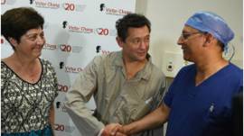 Wagonjwa wawili waliopandikizwa moyo (Michelle Gribilas, kushoto, na Bwana Damen, katikati) wanazungumza na daktari wa upasuaji Kumud Dhital