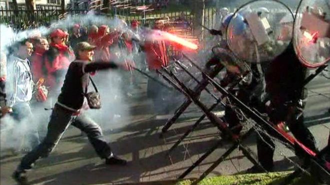 Polisi nchini Ubelgiji katika mji mkuu Brussels, Ubelgiji wamelazimika kutumia mabomu ya machozi na maji ili kuwatawanya waandamanaji wanaopinga sera ya kutaka kuongeza muda kustaafu kwa watumishi wa umma pamoja na kupunguza bajeti ya huduma za jamii.