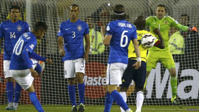 Neymar alionyeshwa kadi nyekundu baada ya kuupiga mpira kimakusudi kwa lengo la kumgonga mchezaji wa Colombia Pablo Armero baada ya kipenga cha mwisho cha mechi kabla ya kumpiga kichwa mchezaji mwengine ambaye alimsongelea.