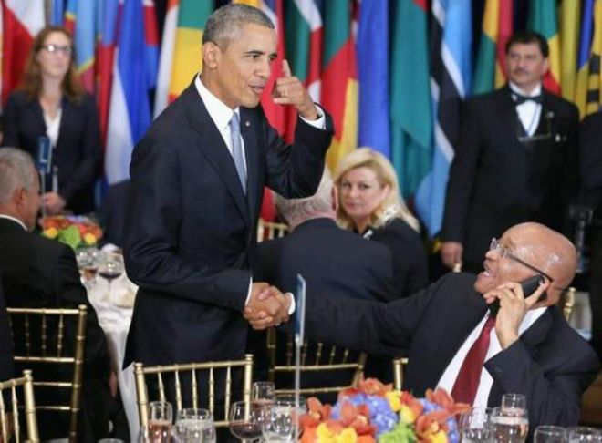Rais Barack Obama wa Marekani akimsalimia Jacob Zuma wa Afrika Kusini huku akimuugilizia kama anaongea na simu.